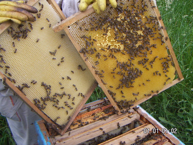 Если отводок правильно собран, то по мере выхода молодых пчёл, он довольно быстро набирает силу, яйценоскость матки возрастает. Отводки расширяем вощиной, которую пчёлы хорошо отстраивают. Чтобы кормовые запасы в отводках всегда были в достатке, в начале июня от каждой основной семьи в отводок переносим несколько рамок с мёдом, а в замен им ставим рамки с вощиной. К середине июня отводки занимают полные корпуса – 12рамок. Пчёл столько, что вощину отстраивают от верхнего бруска до нижнего и расплод покрывает почти всю рамку. Теперь самое время проводить предварительные мероприятия по подготовке пчёл отводка к главному медосбору. В каждой семье-отводке находим матку, заключаем в клетку и опускаем между рамок в улочку на 8-9 дней. За это время весь открытый расплод будет закрыт, много появится молодых пчёл, воспитанных в оптимальных условиях и при обильном кормлении. Примерно, 24 июня отводки ставим через разделительную решётку на основную семью (предварительно убрав клеточку с маткой). Семьи готовы к главному медосбору.
